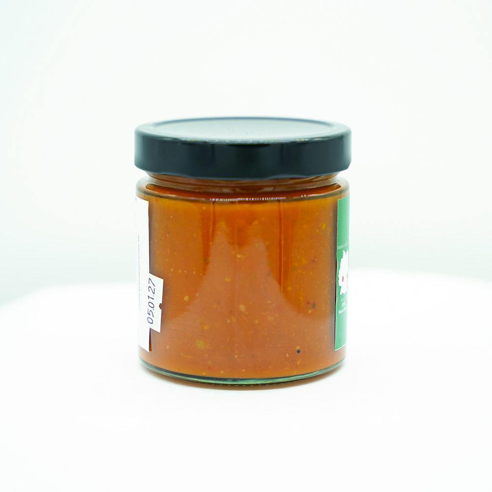 Unser Tomatensößje ist eine ehrliche Tomatensauce mit dem puren Geschmack sonnengereifter Tomaten aus eigener Marktgärtnerei in Eschau. Verarbeitet werden ausschließlich ungespritzte Tomaten, die auf unserem eigenen Feld wachsen und zum optimalen Reifezeitpunkt geerntet werden. Schonend gekocht und verfeinert mit aromatischen Kräutern aus unserem eigenen Anbau, entsteht eine Sauce, die nach Sommer schmeckt – intensiv, rund und natürlich.